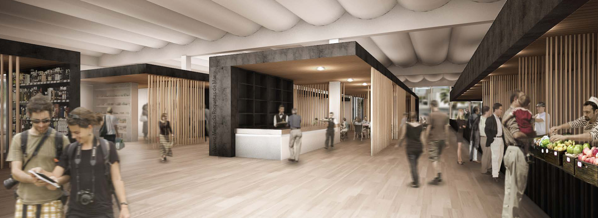 Mercado y plaza actúan como espacios de convivencia e interacción social, desde el producto y la cotidianidad. Planteándose un lugar donde abastecerse, pero no solo de los productos necesarios para la vida, también de las relaciones sociales necesarias para ella. La propuesta para el mercado re-habilita el edificio, pero también el modo actual de re-habitar un espacio público, de acuerdo al modo contemporáneo en el que nos relacionamos. Se presenta así un edificio que resolviendo las necesidades funcionales permita el encuentro, el cruce y la confluencia, para lo cual se potencia la permeabilidad recuperando la envolvente original del mercado y creando una plataforma perimetral no solo de acceso sino de umbral social y transición entre mercado y plaza, dos espacios sociales a negociar, posibilitando el intercambio entre ambos.