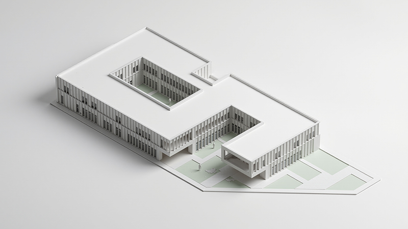 La modulación de la fachada genera ritmo y sombra, aportando privacidad y equilibrio a un conjunto que busca integrarse en su entorno urbano.